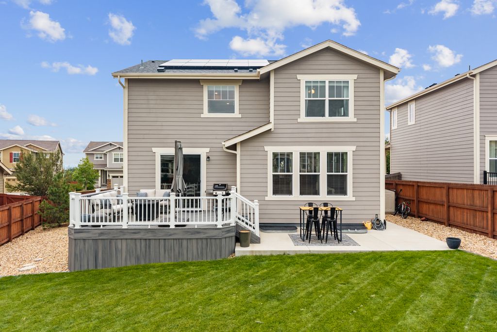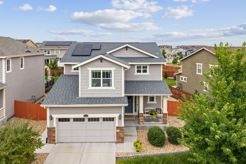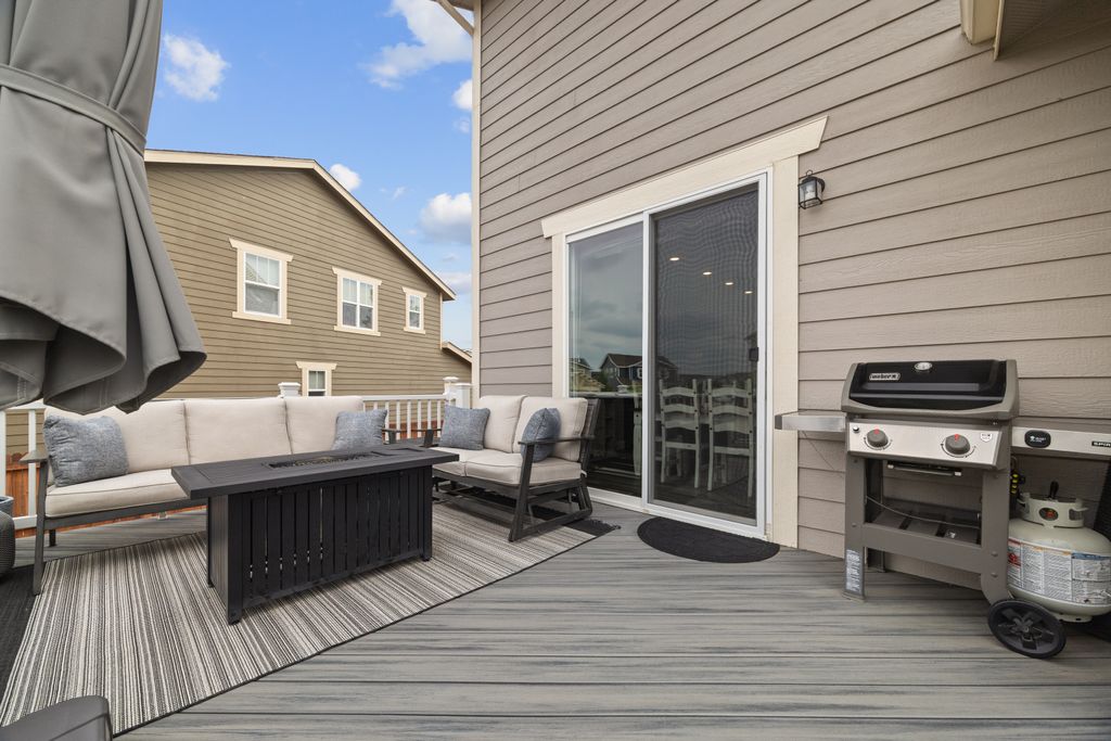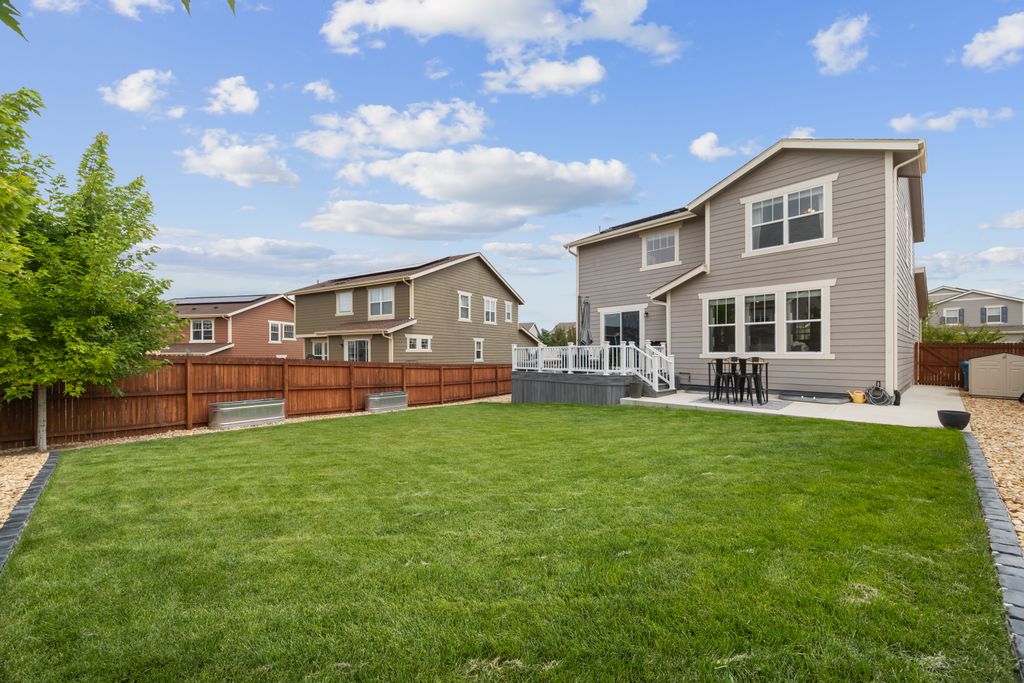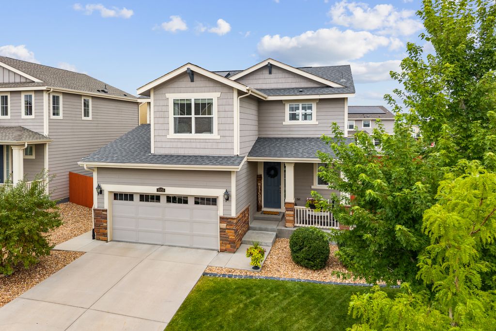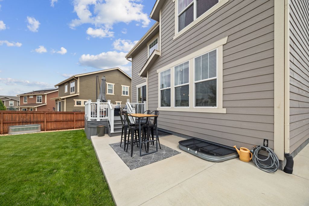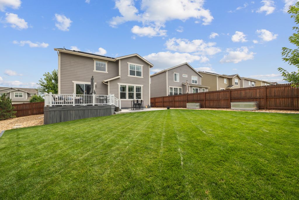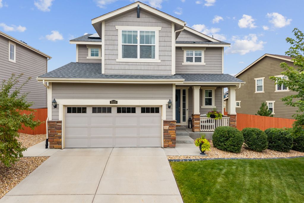 Welcome to 15155 Chicago Street, nestled in the desirable Sierra Ridge community of Parker. This beautifully appointed 4-bedroom, 4-bath home offers 3,139 total square feet of stylish and functional living space on an expansive lot designed for entertaining and everyday comfort. Step inside to find extra-wide vinyl plank flooring throughout the main level, complemented by designer touches and abundant natural light. The chef’s kitchen is a true standout, featuring high-end JennAir appliances, a luxurious built-in Sub-Zero refrigerator, a large island with bar seating and under-mount sink, slab granite countertops, and a corner walk-in pantry. The dining area and spacious great room flow seamlessly, perfect for gatherings. A powder room and a convenient mud bench complete the main level. Upstairs, you'll find four generously sized bedrooms, including a grand primary suite with a coffered ceiling, an updated five-piece ensuite bath with a walk-in shower, soaking tub, and a spacious walk-in closet. Three additional bedrooms, a full bath, and a large laundry room offer plenty of space and convenience. The finished basement is an entertainer’s dream with a full bar area, complete with a full-size fridge and beverage fridge, a large rec room/media room, a half bath with a utility sink, and a generous storage room. Outdoor living shines with a composite deck, cement patio, large lawn, several trees and gas line ready for your grill and fire pit. Located in the vibrant Sierra Ridge community, residents enjoy access to multiple parks, a basketball court, playground, clubhouse, and a community pool. Additional highlights include a whole home humidifier, active radon mitigation system, overhead garage storage racks, raised garden beds, and an inviting covered front porch. Don’t miss the opportunity to own this beautifully finished home in one of Parker’s most desirable neighborhoods—truly a model home in both style and presentation!