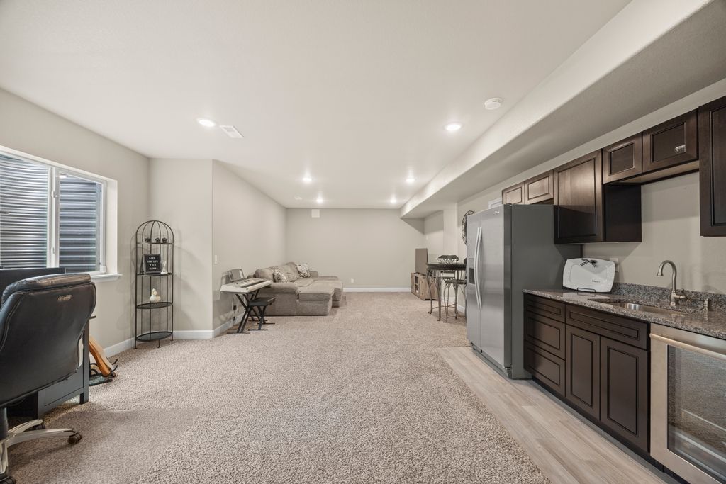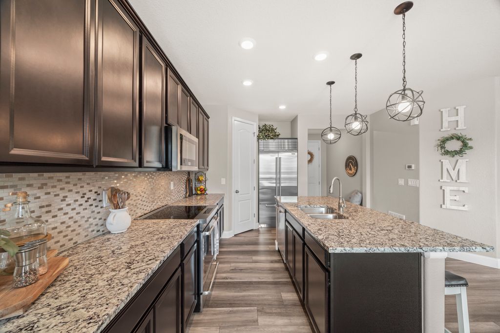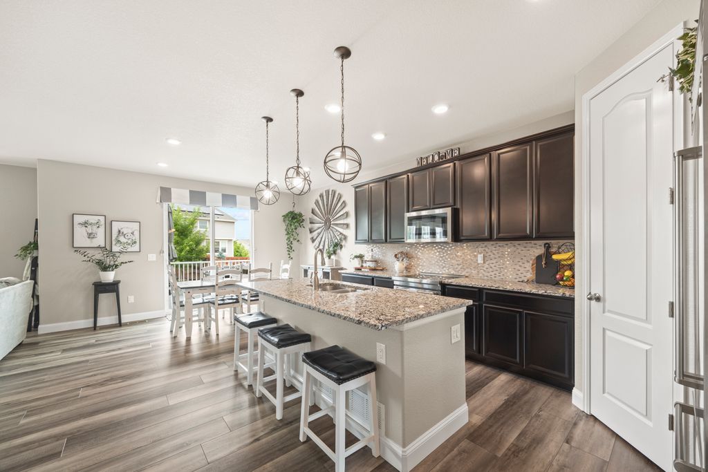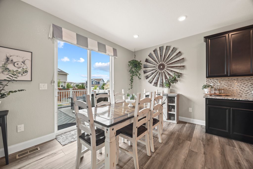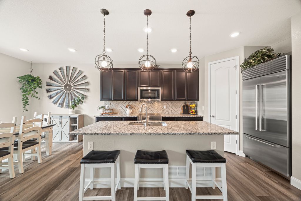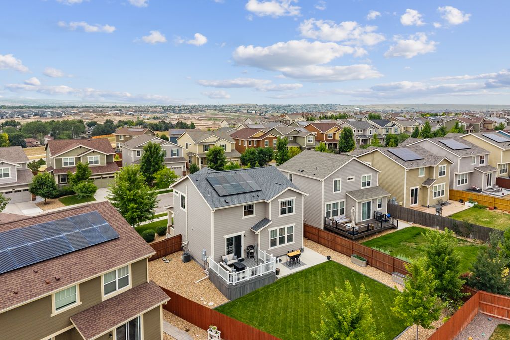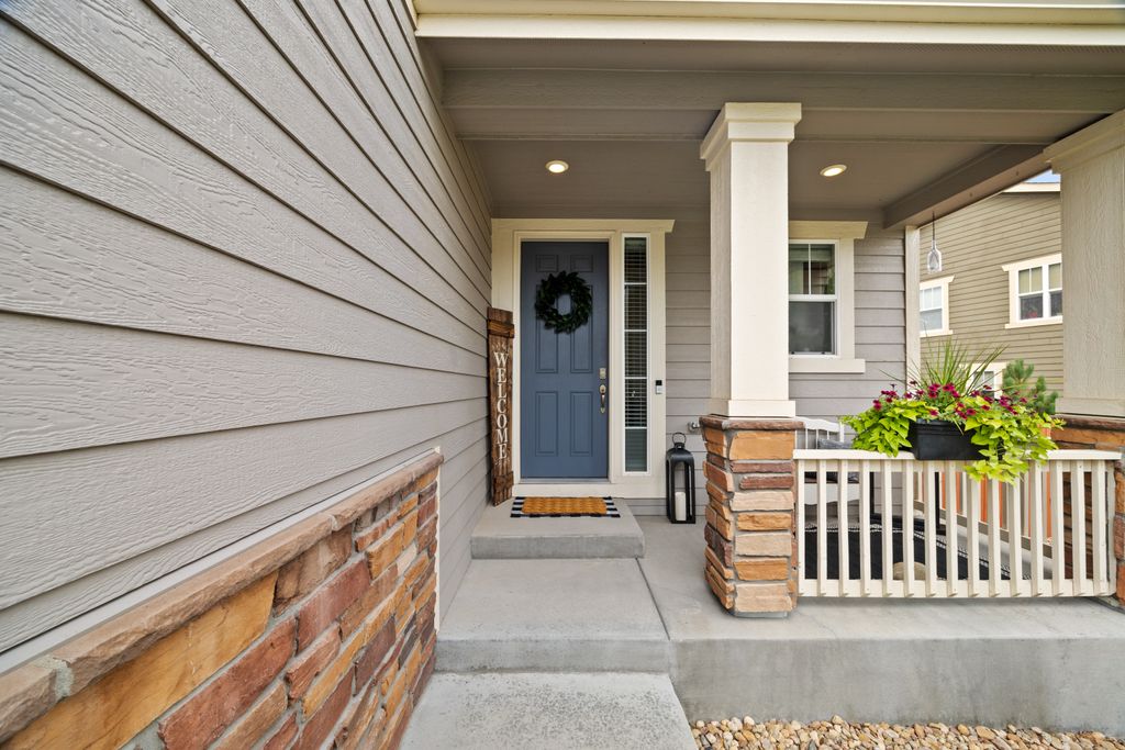 Welcome to 15155 Chicago Street, nestled in the desirable Sierra Ridge community of Parker. This beautifully appointed 4-bedroom, 4-bath home offers 3,139 total square feet of stylish and functional living space on an expansive lot designed for entertaining and everyday comfort. Step inside to find extra-wide vinyl plank flooring throughout the main level, complemented by designer touches and abundant natural light. The chef’s kitchen is a true standout, featuring high-end JennAir appliances, a luxurious built-in Sub-Zero refrigerator, a large island with bar seating and under-mount sink, slab granite countertops, and a corner walk-in pantry. The dining area and spacious great room flow seamlessly, perfect for gatherings. A powder room and a convenient mud bench complete the main level. Upstairs, you'll find four generously sized bedrooms, including a grand primary suite with a coffered ceiling, an updated five-piece ensuite bath with a walk-in shower, soaking tub, and a spacious walk-in closet. Three additional bedrooms, a full bath, and a large laundry room offer plenty of space and convenience. The finished basement is an entertainer’s dream with a full bar area, complete with a full-size fridge and beverage fridge, a large rec room/media room, a half bath with a utility sink, and a generous storage room. Outdoor living shines with a composite deck, cement patio, large lawn, several trees and gas line ready for your grill and fire pit. Located in the vibrant Sierra Ridge community, residents enjoy access to multiple parks, a basketball court, playground, clubhouse, and a community pool. Additional highlights include a whole home humidifier, active radon mitigation system, overhead garage storage racks, raised garden beds, and an inviting covered front porch. Don’t miss the opportunity to own this beautifully finished home in one of Parker’s most desirable neighborhoods—truly a model home in both style and presentation!
